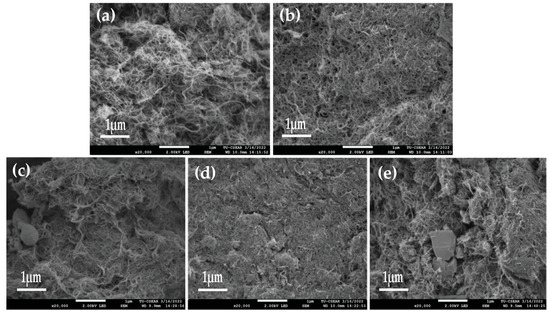 The morphological features and agglomeration of fabrication inks were determined by FE-SEM equipped with EDS. The samples of fabrication ink were subjected to JEOL JSM7800F field emission scanning electron microscopy at 2 kV for two compositions of Nano-ink with and without silver nanoparticles (AgNPs). Figure 3a,b shows randomly interconnected distributions of MWCNTs. The diameter of the MWCNTs-Cs is approximately 20–25 nm. The surface morphology of MWCNTs/SiC/AgNPs (1:1:0)-ink fabricated by using chitosan with medium molecular weights (Mw = 125–500 kDa, %DD = 90–95%) shows higher surface roughness and porosity than ink prepared with high molecular weight chitosan (Figure 4b).