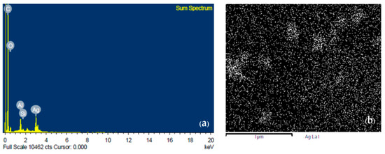 (a) Energy dispersive spectroscopy (EDS) shows visible peaks of C, O, Al, Si, and Ag; (b) silver nanoparticle dispersion mapping by energy-dispersive X-ray spectroscopy (EDS).
