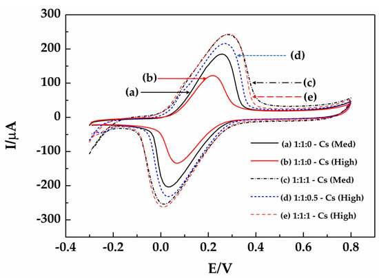 Cyclic voltammograms of the ink composed of MWCNTs/SiC/AgNPs as ratios of (a) 1:1:0-Cs (Med), (b) 1:1:0-Cs (High), (c) 1:1:1-Cs (Med), (d) 1:1:0.5-Cs (High), and (e) 1:1:1-Cs (High) in a 5 mmol dm−3 K3[Fe(CN)6]/K4[Fe(CN)6] solution containing 0.1 M KCl at a scan rate of 10 mVs−1.
