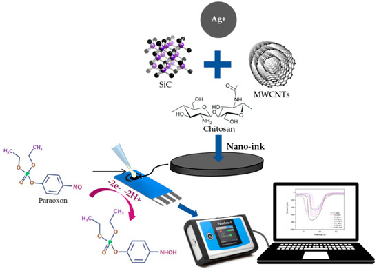 The electrochemical behavior of paraoxon was analyzed by a fabrication ink that consisted of multi-walled carbon nanotubes, silicon carbide, silver nanoparticles, and chitosan as working electrodes on screen-printed carbon electrodes. The schematic illustration of the interaction between electrode modifiers on the electrode surface and the mechanism for paraoxon detection is shown in Figure 7. The sensor selectivity is proven in an experiment in which only paraoxon has been used as the calibration reference and produces a specific peak.