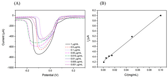 (A) Differential pulse voltammetry (DPV) response of paraoxon (0.001–1 µg/mL) in 0.1 M PBS of pH 7.0 at a scan rate of 25 mVs−1. (B) Calibration plot of the current response vs. the concentration of paraoxon (0.001–0.1 µg/mL) in 0.1 M PBS of pH 7.0 at a scan rate of 25 mVs−1.