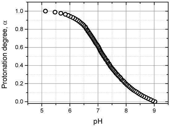 In this work, we used a PNIPAM-based cationic microgel, P(NIPAM-co-DMAPMA), that was synthesized as described elsewhere [26] by precipitation copolymerization of N-isopropylacrylamide (NIPAM) and a cationic comonomer dimethylaminopropyl methacrylamide (DMAPMA), whose content in the reaction mixture was set to 10% (mol.), in the presence of a crosslinking agent N,N’-methylenebisacrylamide. Being dissolved in aqueous media, this microgel forms opalescent dispersions that are stable on the colloidal level. Potentiometric titration of the P(NIPAM-co-DMAPMA) microgel was performed to quantify the amount of the DMAPMA comonomer, which was included in the microgel upon its preparation, and to reveal the pH window corresponding to the reversible protonation–deprotonation of the DMAPMA units (Figure 1). The actual content of the DMAPMA units in the microgel was found to be about 9% (mol.), which is close to the amount taken for the synthesis. As seen, the full protonation of the P(NIPAM-co-DMAPMA) microgel was observed at pH ≤ 5.2, while all the DMAPMA units in the microgel were deprotonated at pH ≥ 9, being in good accordance with the former findings reported elsewhere [20,23].
