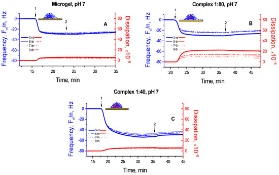 Figure 3. Normalized frequency Fn/n (blue lines) and dissipation D (red lines) shifts for the gold-coated quartz crystal upon the adsorption at pH 7 of the P(NIPAM-co-DMAPMA) microgel (A); the preformed microgel–enzyme complex at [GO]:[DMAPMA] = 1:80 (B); and the preformed microgel–enzyme complex at [GO]:[DMAPMA] = 1:40 (C). 1—adsorption of the pristine microgel (A) or the microgel–enzyme complex (B,C) in 10 mM TRIS/TRIS-HCl of pH 7; 2—washing with 10 mM TRIS/TRIS-HCl of pH 7. The experiments were carried out at 25 °C.