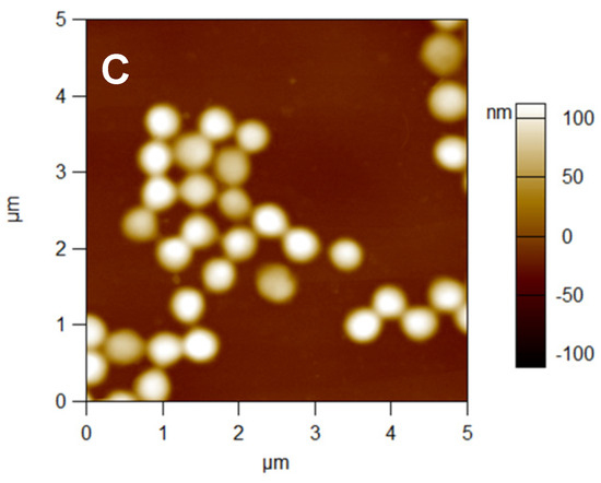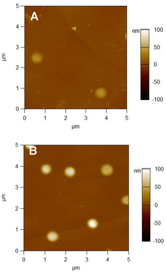 The evaluated numbers of the round-shaped objects per scan (the adsorbed P(NIPAM-co-DMAPMA) microgel and its complexes with GO) are summarized in Table 2 along with their size/shape characteristics. Indeed, the pristine microgel (Figure 5A) appeared in the images as more flattened (thin) objects having a height of about 44 nm, while the microgel–enzyme complexes (Figure 5B,C) appeared as less flattened (thicker) objects with heights of about 84 nm and 133 nm for [GO]:[DMAPMA] = 1:80 and 1:40, respectively. These changes in heights were accompanied by a notable decrease in the diameters of the objects.