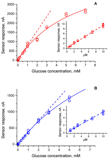 Figure 6. The dependence of the steady-state current on the β-D-glucose concentration for SPE/MnO2/Microgel (pH 9.5)/GO (A) and SPE/MnO2/Microgel-GO ([GO]/[DMAPMA] = 1:80) (B) constructs. Conditions: 50 mM HEPES/30 mM KCl (pH 7.5), room temperature. Linear regression: Y = (1.4 × 10−3 ± 3.5 × 10−3) + (785.7 ± 12.0) × X, R2 = 0.9869 (A), Y = (2.1 × 10−3 ± 1.7 × 10−3) + (365.6 ± 3.2) × X, R2 = 0.9955 (B), where Y represents the current in nA and X represents the β-D-glucose concentration in mM. Inserts: initial part of the calibration curves. The solid lines are drawn through the experimental points only as a guide for the eyes. The dashed lines represent the corresponding linear regressions.
