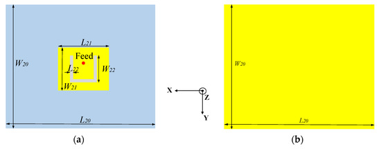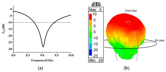 In order to realize the low-profile characteristic of the antenna, a planar microstrip antenna is adopted instead of the horn as the metasurface feed. Figure 1a shows the front structure of the feed antenna, with the yellow part being copper and the gray part being a 1.5 mm thick F4B dielectric substrate (; ). A U-shaped slot is etched on the radiation patch to improve the current distribution and achieve a wider bandwidth and higher gain than an ordinary microstrip without a slot. The back of the substrate is covered with copper to ensure that the antenna keeps the broadside radiation mode, as shown in Figure 1b. It can be seen from Figure 2a that the antenna operates in the range of 8.7–9.5 GHz, and Figure 2b shows the 3D pattern of the antenna with a peak gain of 9 dBi.