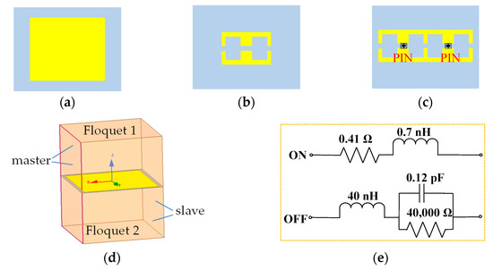 Three types of units. (a) unit 1; (b) unit 2; (c) unit 3; (d) diagram of unit cell boundary conditions; (e) the equivalent circuit of PIN diode.