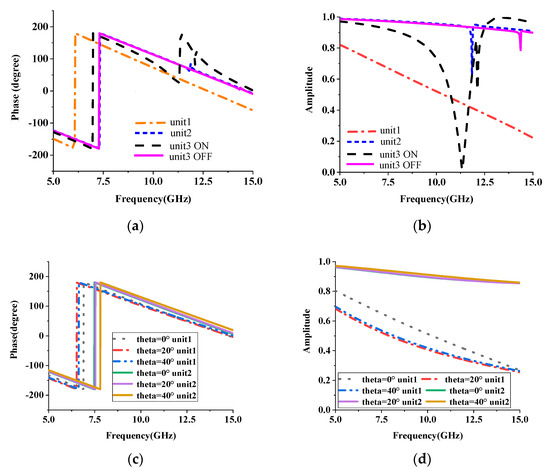The transmission characteristics are simulated using ANSYS Electromagnetics Suite. Each unit is simulated using periodic boundary conditions and Floquet ports, as shown in Figure 3d. The incident uniform plane wave is a TE linearly polarized wave. During the simulation, we used the equivalent circuit shown in Figure 3e to replace the OFF or ON state of the diode. From Figure 4a,b, we know that unit 1 and unit 2 have different amplitude and phase responses to electromagnetic waves, enabling the manipulation of electromagnetic waves from two dimensions. Unit 2 and unit 3 (in OFF state) have almost the same amplitude and phase properties at 11.2 GHz. In terms of amplitude, when all PIN diodes are in the ON state, the transmissivity of the TE wave in unit 3 is almost 0 at 11.2 GHz. When all PIN diodes are in the OFF state, the transmissivity is 0.96. When electromagnetic waves are incident from different angles, the phase and amplitude responses of the units remain relatively stable. It should be noted that due to the similar characteristics of unit 3 and unit 2, Figure 4c,d only show the situation of unit 1 and unit 2. The amplitude difference close to 1 will have a great impact on electromagnetic waves and help the metasurface to manipulate the transmitted waves.