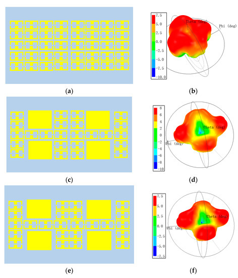 It can be seen from Section 2.2 that there are phase differences among the three types of unit cells, and they have different transmittances. Therefore, by arranging these three units, a metasurface with an amplitude and phase gradient can be formed to control the antenna radiation beam. The effect of the metasurface with different combinations on the far-field radiation pattern is studied by placing the metasurface at the same height above the feed antenna and keeping other conditions unchanged.