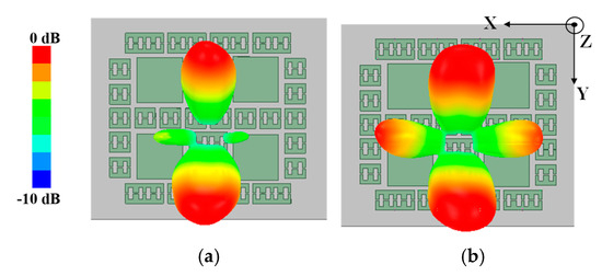 The two layers are separated by an air cavity with the height of h3. As shown in Figure 7, when all PIN diodes are turned on, the antenna radiates two beams; when all PIN diodes are in the OFF state, the antenna radiates four beams. It must be noted that the patterns in Figure 7 are observed at 9.28 GHz, which is lower than the results discussed in Figure 4. This is due to the non-periodic arrangement of the units, which is different from Figure 3. Another reason is the difference in incident plane waves. The simulation of the unit uses uniform plane wave incidence, while the proposed metasurface is illuminated using electromagnetic waves radiated by a planar microstrip feed. These reasons result in a red shift in the operating frequency of the antenna.
