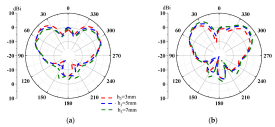 Two-dimensional radiation pattern of antenna with different h3 values. (a) XOZ-plane; (b) YOZ-plane.
