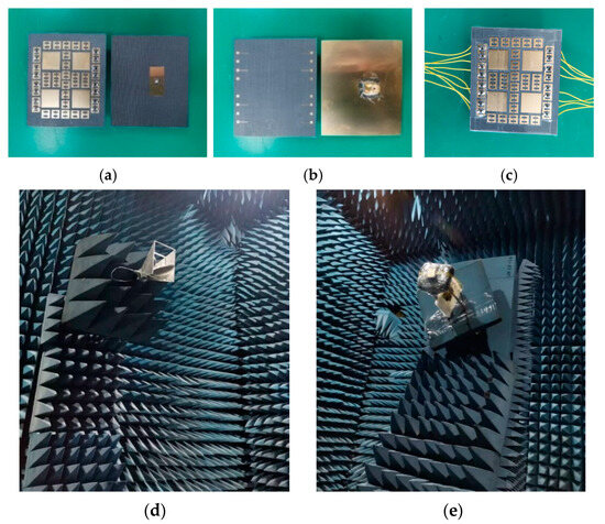 Fabricated prototypes and testing environment. (a) Front view and (b) back view of the hybrid metasurface and the source antenna; (c) front view of overall structure; (d) standard receiving antenna in microwave anechoic chamber; (e) the proposed antenna under test.