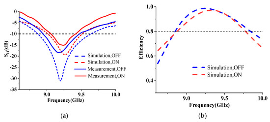Figure 11b gives the simulated radiation efficiency, from which it can be seen that in the working band of the antenna, the radiation efficiency under two states is greater than 80%. Although the amplitude is modulated by the proposed metasurface, the total radiation efficiency of the antenna is not affected since the transmission amplitude of unit 2 and unit 3 (in the OFF state) is close to 1.