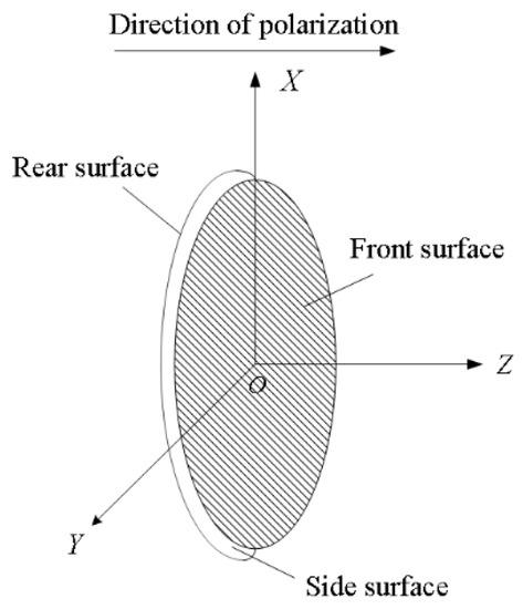 Because the thickness of the transducer is much thinner than its radius and the intrinsic vibration frequency in the thickness direction is much higher than that in the radial direction, a simplified electric field applied to the transducer in the thickness direction may be helpful. Such a transducer is in a clipped state, with no time to deform in the radial direction, and only the strain component (S3) in the Z direction on the Z surface is nonzero.