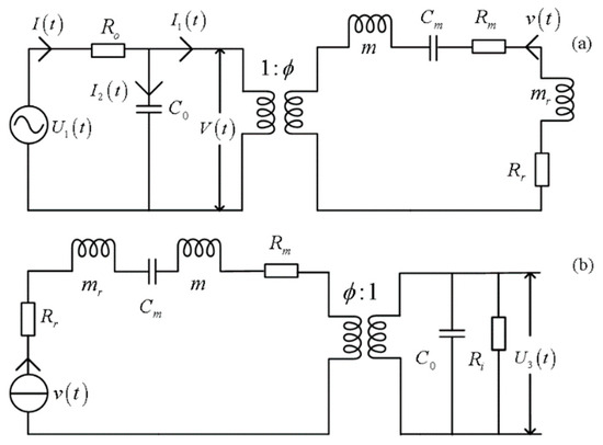 We must pay attention to substantial differences in the characteristics and the analysis methods between conventional circuits and the mechanical–electric equivalent circuit of the transducer. The values of all components, e.g., resistance and inductance, etc., are independent of frequency in conventional circuits. In contrast, some mechanical elements in the mechanical–electric equivalent electric circuits of the transducer are functions of frequency, e.g., radiation resistance and radiation quality, as shown in Figure 3.