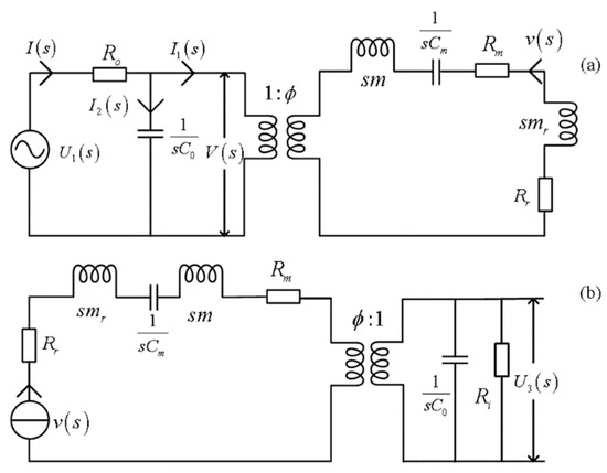 The mechanical–electric equivalent circuits in the time domain, as shown in Figure 3, were transformed into the s domain, as shown in Figure 4. From there, we analyze the inherent characteristics of the transducer and solve its electric–acoustic (and acoustic–electric) impulse responses and the corresponding electric–acoustic (and acoustic–electric) system functions.