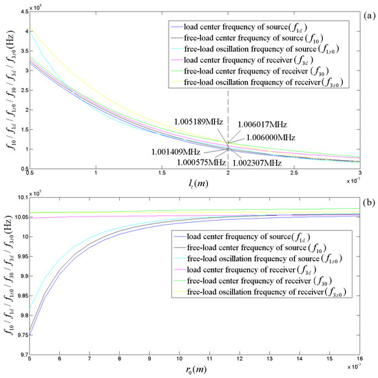 Taking the radius () of the transducer to be 8 mm as an example, Figure 5a displays the free-load center, load center, and free-load oscillation frequencies of the transducer versus its thickness. Figure 5a shows that regardless of whether the transducer is a source or a receiver, (i) the above three kinds of frequencies decrease significantly with increasing thickness. (ii) The free-load center, load center, and oscillation frequencies of the receiver are slightly higher than those of the source. (iii) The free-load center frequency is slightly higher than the load center frequency. (iv) The oscillation frequency can be greater than the free-load center frequency within a radius range, and it can also be lower than the latter in another radius range; this is because the effect of the radius on the direct current of the impulse response (electric–acoustic or acoustic–electric) is smaller than that of the oscillation frequency for the first case, and the effect of the radius on the direct current of the impulse response is more significant than the oscillation frequency for the second case. At 2 mm and 8 mm, MHz, 1.000575 MHz, 1.002307 MHz, 1.006017 MHz, 1.005189 MHz, and 1.006000 MHz.