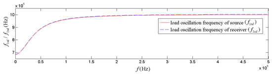 Figure 6 is the calculated relationships of load oscillation frequencies ( and ) of both source and receiver versus the sinusoidal frequency (f) of the excitation signal exerted on the transducer (electric or acoustic). It displays and has a monotonic increasing tendency with both the frequency of the sinusoidal driving-voltage signal and that of the acoustic signal arriving at the receiver. It also shows that the sinusoidal signal frequency has a more significant effect on the load oscillation frequency in the lower frequency range and has a minimal impact on the load oscillation frequency in the higher frequency range. The loading oscillation frequency of the transducer (as a source or as a receiver) approaches its free-load center frequency as the frequency of the applied sinusoidal signal increases. The load oscillation frequency of the source signal is slightly smaller than that of the receiver.