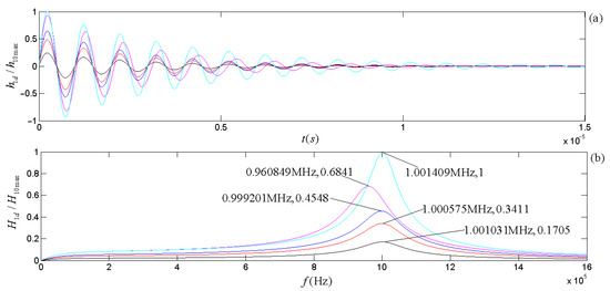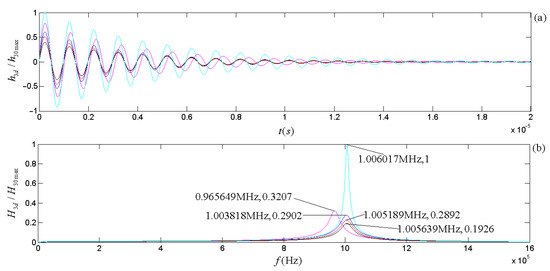 The acoustic–electric impulse responses of the receiver and the corresponding amplitude spectra: (a) acoustic–electric impulse responses; (b) amplitude spectra. We have normalized acoustic–electric impulse responses and amplitude spectra using the maximum value of the impulse response and amplitude spectrum for the case of free load, respectively. The cyan curve is the acoustic–electric impulse response and the corresponding amplitude spectrum for the free load. The other colors are those with mechanical load: the lines in magenta, blue, red, and black are the transducer acoustic–electric impulse responses, and the amplitude spectra of the corresponding system functions at selected frequencies of 0.1 , 0.5 , 1.0 , and 10 . Here, = 1.005189 MHz.