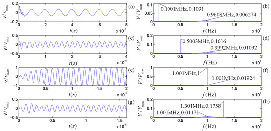 Surface vibration velocity and corresponding amplitude spectrum of the source excited by sinusoidal driving-voltage signals with different frequencies: (a,c,e,g) are the waveforms in the time domain; (b,d,f,h) are the corresponding amplitude spectra.