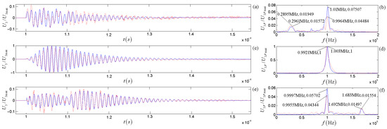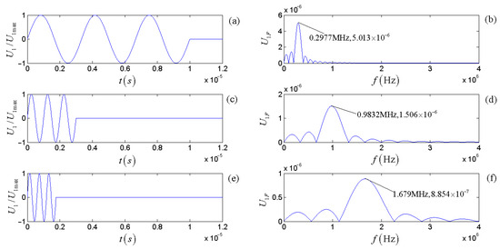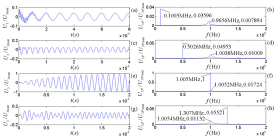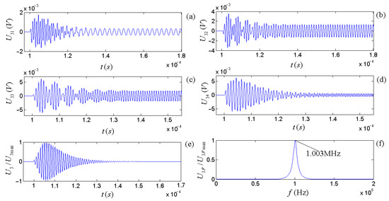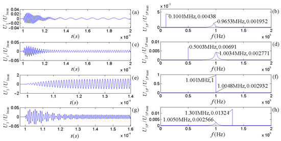 To analyze only the acoustic–electric conversion characteristics of the transducer, sinusoidal acoustic signals with an amplitude of 1 V and frequencies of 0.1 , 0.5 , , and 1.3 are directly input into the mechanical terminals of the receiver. Here, the central frequency is = 1.005189 MHz. Figure 10 shows the voltage signal outputted by the electric terminals of the receiver after acoustic–electric conversion.