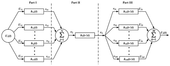 - Extending the single-frequency circuit network (Figure 3) to parallel multiple-circuit networks (Parts I and III of Figure 12) is necessary for the transitions of the multifrequency signal wavelet. Since thin-wafer transducers’ radiation resistance and mass are frequency functions, we may express the electric–acoustic (acoustic–electric) conversion excited by a multifrequency signal wavelet using a parallel transmission network, i.e., an equivalent mechanical–electric circuit network. The cumulative output from the parallel-circuit network represents the acoustic signal wavelet that is radiated outward by the source (and the measured acoustic signal wavelet, i.e., the electric signal wavelet at the receiver’s terminals).