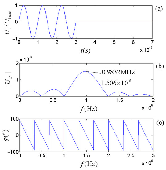where , , , , , and . In this case, the source is in an under-damped state, and the radiated acoustic waves proceed outwards under the excitation of the driving-voltage signal, in line with the actual physical condition. The source’s oscillation frequency is related to the radiation resistance and mass, so it is an important physical quantity for describing the characteristics of the transient process generated by the transducer under the excitation of any sinusoidal voltage signal with a given frequency.
