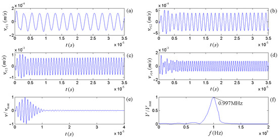 Four sinusoidal driving-voltage signals with an amplitude of 1 V are selected, and their four frequencies are selected as 0.1 , 0.5 , 1 , and 1.3 to excite the source ( = 1.000575 MHz). Figure 9 shows the calculated vibration velocity of the source’s surface.