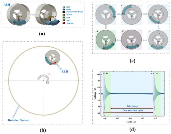 Operating principle of the REH: (a) composition of the REH; (b) REH in the rotating system; (c) operating principle of the REH; (d) open−circuit voltage waveform of the REH (system rotation speed ω = 30 rpm, number of paddles n = 1, number of piezoelectric beams k = 1).