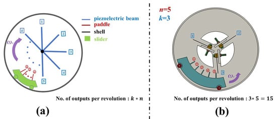 Therefore, in order to enhance the output performance of the proposed REH, our goal was to minimize the proportion of the “idle stage” during the operation of the REH. We proposed a feasible solution to achieve a reduction in the “idle stage” by increasing the number of paddles attached to the slider, thereby increasing the frequency of the piezoelectric beams being actuated within one rotation cycle. Additionally, by increasing the number of piezoelectric beams inside the REH, the number of times the beams were actuated within one rotation cycle could also be increased. Therefore, when the REH contained k piezo beams and n paddles, the number of external outputs per rotation cycle reached (the second frequency up-conversion), as shown in Figure 2a (for example, when n = 5 and k = 3, the REH obtained is shown in Figure 2b).