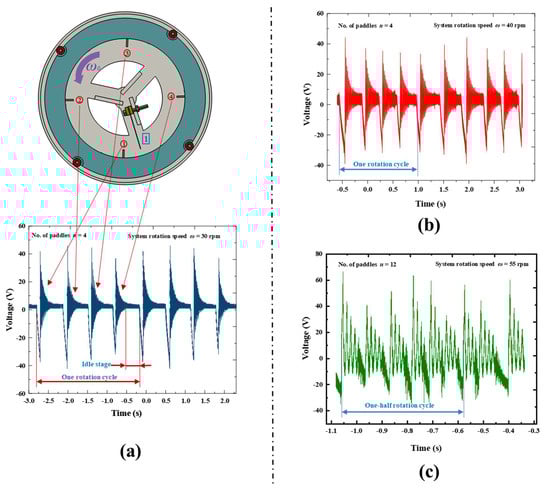In order to validate the feasibility of the design concept, we conducted preliminary experiments using an REH equipped with a single piezoelectric beam. The REH-4 (an REH with four attached paddles, n = 4) was employed for testing, and the obtained waveforms are depicted in Figure 3a. Under the same rotational speed (30 rpm), as the number of paddles increased, the time interval between adjacent waveforms decreased. This indicated a higher proportion of effective working time for the REH within an ultra-low-frequency rotational environment. Therefore, increasing the number of paddles was a feasible approach to enhance the output performance of the proposed REH. Additionally, we tested the output waveforms of the device with different numbers of paddles and higher system rotational speeds, as shown in Figure 3b,c. From the figures, it can be observed that interference occurred between adjacent waveforms when the number of paddles or rotational speed exceeded a certain threshold. The impact of this interference on the REH’s performance was further investigated in subsequent experiments.
