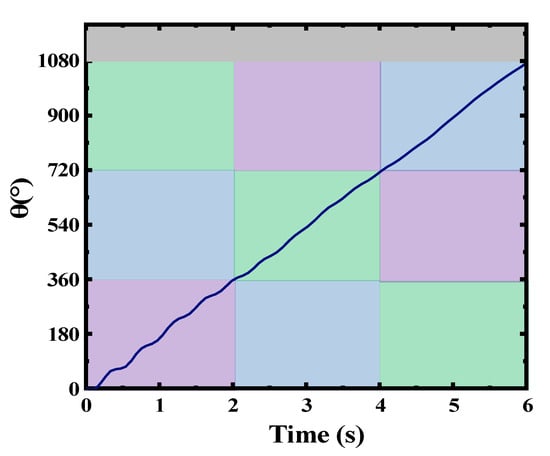 Based on Equations (1) and (2), the variation in the relative angular displacement between the center of mass of the slider and the shell with time could be obtained. Subsequently, the MATLAB Simulink module could be used to simulate the variation in the relative angular displacement with time. The simulation results are shown in Figure 5. Under low-speed conditions (taking the system speed as 30 rpm, l0 = 120 mm, R = 53 mm, and r = 20 mm), the angular displacement θ of the slider increased with time, while the angular velocity of the slider remained nearly constant during the rotation of the system. This phenomenon was also verified in practical experiments. Based on the analysis above, we could draw the conclusion that at lower system rotation speeds (<1 Hz), the relative rotational speed between the slider and the shell remained stable and numerically equal to the system’s rotation speed. This result was also verified in subsequent experiments, as depicted by the waveforms in Figure 3.