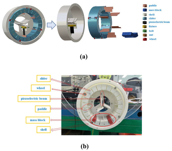 The shell, slider, and paddles were all produced via 3D-printing technology, utilizing UV-curable resin material (SOMOS Imagine 8000, Royal DSM Group, Heerlen, the Netherlands). The cylindrical shell had a diameter of 231 mm, a height of 76 mm, and an inner-wall thickness of 2 mm. The piezoelectric cantilever beam (PZT 5J S118-J1SS-1808YB) in the device was produced by Mide Technology Company in the United States,, with detailed parameters provided in Table 2. The outer dimensions of the slider were a 217 mm diameter, 150 mm inner diameter, 65 mm axial thickness, and a wall thickness of 2 mm. The profile dimensions of the paddles were 65 mm × 50 mm × 2 mm.