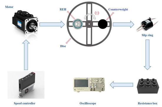 To test the performance of the REH, a comprehensive testing system was established, as shown in Figure 7. The rotational excitation was provided by a servo motor, with the rotational speed controlled by a controller. The REH was installed on an acrylic disc with a diameter of 1200 mm, and the eccentricity distance of the REH was adjusted through an array of small holes on the disc. One REH and one counterweight were mounted on the left and right sides of the disc, respectively, and balanced using the lever principle to ensure the stable rotation of the entire system. The output (VRMS) of the piezoelectric beams inside the REH was measured and recorded by connecting wires through a slip ring to an oscilloscope (Keysight DSO-X 2024A, Keysight Technologies, Santa Rosa, CA, USA).