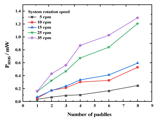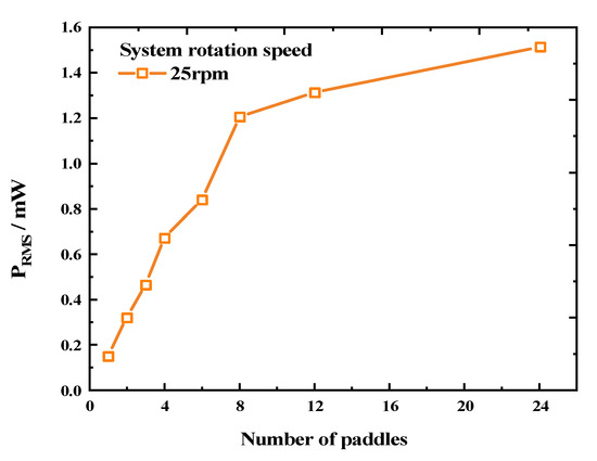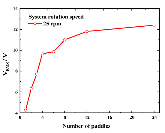 To investigate the feasibility of enhancing the output performance of a rotational energy harvester (REH) in ultra-low-frequency rotating environments by increasing the number of paddles, we tested the output characteristics of an REH with a piezoelectric beam under the experimental conditions of a system speed of 25 rpm and eccentricity distance of 160 mm. The VRMS (root mean square of voltage) results are shown in Figure 8. It can be observed that as the number of paddles increased from 1 to 8, the effective output voltage of the REH rapidly rose from 4.25 V to 11 V. However, as the number of paddles further increased, the rising trend weakened. The open-circuit voltages obtained for 12 and 24 paddles were 11.8 V and 12.4 V, respectively. These represent only a 7.3% and 12.7% increment compared to REH-8, despite having 1.5 and 3 times more paddles, respectively. This phenomenon could be attributed to the decreasing time interval for the piezoelectric beam to be actuated as the number of paddles increased. This was manifested in the output waveform shown in Figure 3c, where with an increasing number of paddles, an overlap between adjacent output waveforms became apparent. This led to energy loss, thereby limiting the improvement in the REH’s output performance.
