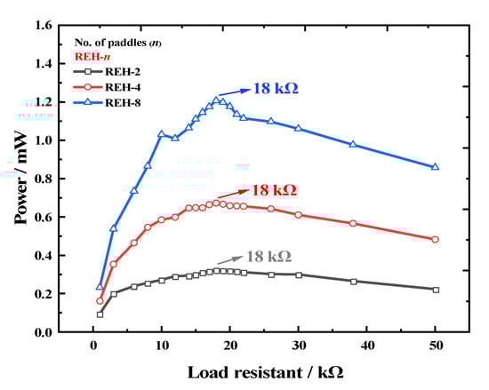 To further validate the relationship between the number of paddles and the output performance, we studied the variation in power with the number of paddles at the optimal load for the REH. First, under the experimental conditions of a system speed of 25 rpm and an eccentricity distance of 160 mm, we tested the optimal load characteristics of an REH with 2, 4, and 8 paddles. As shown in Figure 9, the optimal load (R) values for all three configurations were around 18 kΩ, indicating that the number of paddles did not alter the optimal load of the device.