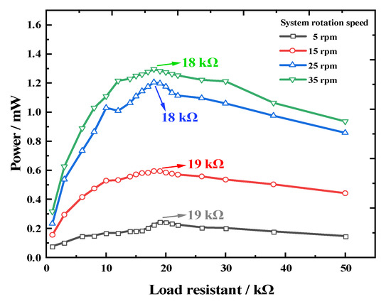 To explore the influence of the rotational speed on the REH output performance, we initially studied the optimal load characteristics of the REH at different speeds. Taking REH-8 as the test specimen, we performed measurements of the optimal load under four different speeds (5 rpm, 15 rpm, 25 rpm, and 35 rpm) when the eccentricity distance was set at 160 mm. The results shown in Figure 11 indicate that the optimal load values for the device remained around 19 kΩ for 5 rpm and 15 rpm conditions, while for 25 rpm and 35 rpm conditions, the optimal load values were around 18 kΩ. Thus, at lower rotational speeds, the REH’s optimal load remained between 18 kΩ and 19 kΩ.