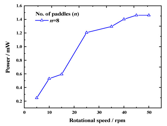 Variation in output power according to rotational speed (number of paddles n = 8).