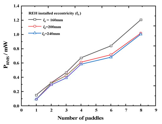 Output power of the REH as a function of the number of paddles under different eccentricities (system rotation speed ω = 25 rpm).