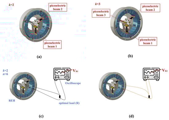 Multi-piezoelectric-beam REH model and output testing method: (a) the REH with an internal piezoelectric beam count of k = 2; (b) the REH with an internal piezoelectric beam count of k = 3; (c) the measurement of VR for piezoelectric beam 1; (d) the measurement of VR for piezoelectric beam 2.