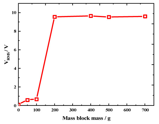 Variation in open-circuit voltage according to the mass block mass (system rotation speed ω = 30 rpm, number of paddles n = 8, number of piezoelectric beams k = 1).
