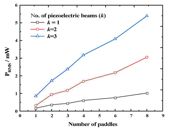 Output power of the REH as a function of the number of paddles under different numbers of piezoelectric beams (system rotation speed ω = 25 rpm).