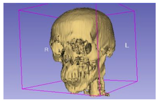 Computed tomography (CT) scan data of a 29-year-old Asian man were gathered. The 3D Slicer imported the DICOM (Digital Image and Communication in Medicine) file obtained in [18]. The three images, namely the axial, sagittal, and coronal planes were visible on the imported data. The axial plane was scanned at a 5 mm offset, resulting in 53 slices, and the coronal and sagittal planes were scanned at a 1 mm offset, resulting in 231 slices on each plane. The 200 HU–1000 HU threshold effect, based on Hounsfield units, was used to distinguish the bone from the surrounding muscle, skin, and tissue. The mandible, skull, and spine models were then separated via the segmenting of each of the slices, in order to create a rough model of the skull and mandible, as depicted in Figure 1.