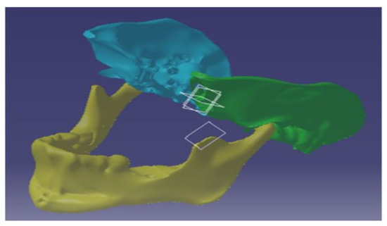 Similarly to the previous phase, the segmented skull model from the DICOM file, generated via 3D Slicer, was imported and smoothed in Meshmixer. Then, a plane cut was made to condense the section of the temporal bone that was of interest. After the plane had been cut, we fixed the model and divided it into the temporal zone. After modelling, the temporal bone was imported into CATIA. The model was transformed to a solid model, with compensation for the decreased thickness in the temporal bone. The assembly of the mandible and temporal bone was performed once both sides of the temporal bone had been sculpted. The distance between the jaw and temporal bones was taken into account when assembling all three models, as depicted in Figure 2.