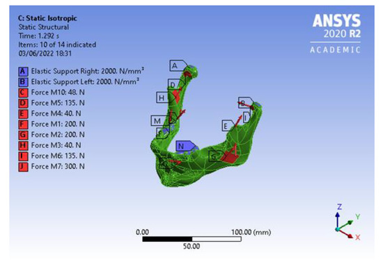In carrying out the study, a bite force of 1000 N was considered, corresponding to maximum chewing forces [25] and the safety factor. The forces are summarised in Table 3 [25]. The forces were applied to the incision points on the body (mandible) and the closure points on the body (skull), as shown in Figure 4. Other boundary conditions are also shown in Figure 4, which include fixed support to the tooth (molar region), because this would be the region of contact of the mandible with the skull, and would not move once the load was applied in the closed-jaw or clenched condition. Elastic support was provided at the region where the articular disc met the skull, because the region would be slightly damped, and would not act as a rigid fixed support.