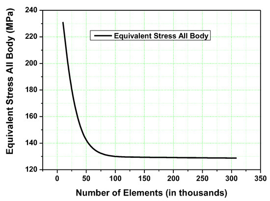 In this study, adaptive meshing was performed, using quadratic tetrahedral elements. The intact human mandible was meshed with a varying number of elements, ranging from 5000 to 308,748. For each case, the change in equivalent stress in the whole body was observed. Figure 5 shows the variation in the equivalent stress with the number of elements in the human mandible. With the use of 110,270 elements, a 129.5 MPa pressure was observed. An increase in the number of elements up to 308,748 brings a deviation of the order 0.5%. The equivalent stress converges within 0.5%, and further refinement is not needed.