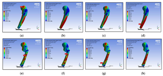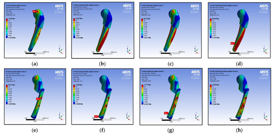 Von Mises stress contours for customised implant-1: (a) without an articular disc (isotropic mandible); (b) with an articular disc (isotropic mandible); (c) without an articular disc (orthotropic mandible); (d) with an articular disc (orthotropic mandible); Von Mises stress contours for customised implant-2: (e) without an articular disc (isotropic mandible); (f) with an articular disc (isotropic mandible); (g) without an articular disc (orthotropic mandible); (h) with an articular disc (orthotropic mandible).