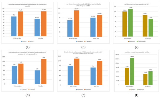Comparison of Custom 1 and Custom 2 TMJ implants: (a) von Mises stress for the isotropic material, (b) von Mises stress for the orthotropic material, (c) von Mises stress for the intact mandible, (d) principal strain for the isotropic material, (e) principal strain for the orthotropic material, (f) principal strain for the intact mandible.