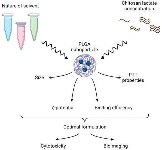 In conclusion, our study examined the role of the PVA solvent and chitosan lactate concentration used during synthesis on the size, charge, and photothermal properties of nanoparticles. Our results indicated that the PVA solvent and chitosan lactate concentration did not directly affect the physico-chemical properties of the PLGA NPs, but had a significant influence on their photothermal properties.