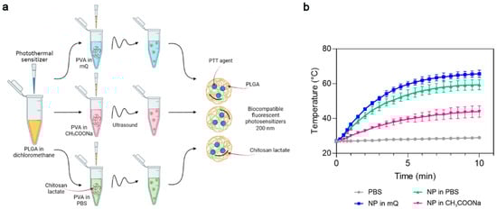 First, we studied the influence of the PVA solvent used during synthesis on the photothermal properties of the PLGA NP. Phthalocyanine-loaded PLGA NPs were synthesized using Milli-Q-water (mQ), pH 6.2, sodium acetate buffer, pH 4.5 (CH3COONa) or PBS buffer, pH 7.4 as the PVA solvent (Figure 2a). The concentration of chitosan lactate was maintained at 1 g/L in all these buffer systems. The photothermal properties of the magnesium phthalocyanine-loaded PLGA NPs (PLGA/Pht-Mg) were investigated by irradiating a solution of NPs in water with an 808 nm laser for 10 min.